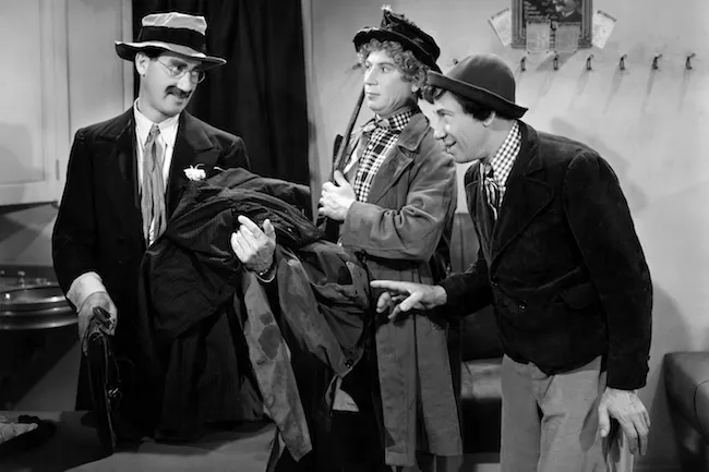 The story revolves around Judy Standish (Maureen O’Sullivan), the sweet young owner of the struggling Standish Sanitarium. Judy faces bankruptcy and loss of ownership unless she can pay her bills in time. Waiting to buy the place for five grand is shady race track owner Morgan (Douglass Dumbrille), who wants to convert it into a gambling casino for his nearby racetrack customers. Helping Morgan bring Judy to ruin is her shifty business manager Whitmore (Leonard Ceeley). Judy’s nightclub crooner boyfriend Gil Stewart (Allan Jones) buys a race horse called Hi-Hat with the last cent he had, and hopes to win the big race in time to save her place. But Judy relies on her wealthy socialite patient Emily Upjohn (Margaret Dumont) to help with the finances, after she hires the quack Dr. Hugo Z. Hackenbush (Groucho Marx) to be the chief of staff upon learning he’s the only doctor Mrs. Upjohn trusts. What Judy doesn’t know, is that he’s a horse doctor. Also around to help the lady in distress is racetrack tipster Tony (Chico Marx) and jockey Stuffy (Harpo), fired by Morgan for failing to dump a race.