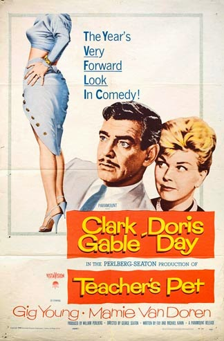 TEACHER’S PET(director: George Seaton; screenwriters: Fay and Michael Kanin; cinematographer: Haskell B. Boggs; editor: Alma Macrorie; music: Roy Webb; cast: Clark Gable (James Gannon/James Gallagher), Doris Day (Erica Stone), Gig Young (Dr. Hugo Pine), Mamie Van Doren (Peggy DeFore), Lloyd Crowley (Harry Antrim), Nick Adams (Barney Kovac), Peter Baldwin (Harold Miller), Marion Ross (Katy Fuller), Charles Lane (Roy), Florenz Ames (Colonel Ballentine), Vivian Nathan (Mrs. Edna Kovac), Jack Albertson (Guide); Runtime: 120; MPAA Rating: NR; producer: William Perlberg; Paramount; 1958)