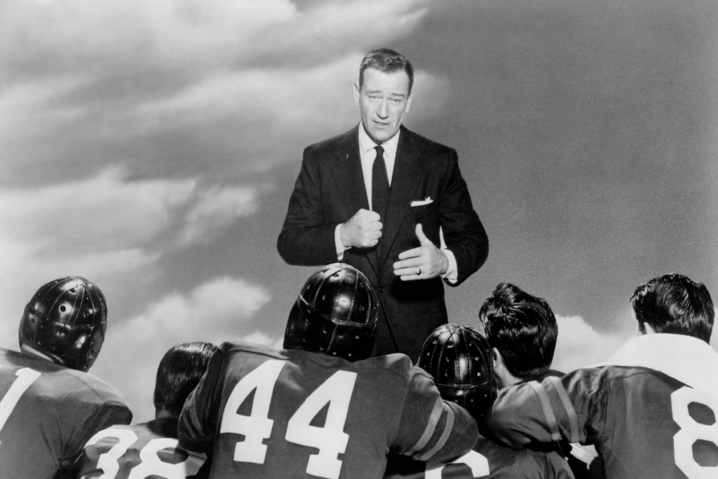 Tiny fictional College of St. Anthony in NYC will close unless it raises $170,000 for the next semester. The elderly dedicated rector Father Burke (Charles Coburn) feels the only way to raise the amount is through football. Steve Williams (John Wayne) was once a great football player and coach, but got kicked out of several top college coaching jobs for nonconformity to the rules and is now a down-and-out bookie. Divorced from his haughty wife Anne (Marie Windsor), who is now married to a wealthy cold fish of a businessman Harold McCormick (Tom Helmore), Steve is raising their feisty 12-year-old tomboy daughter Carole (Sherry Jackson) with lots of love. Out of spite, not because she loves Carole, Anne has filed for child custody and a young prim Alice Singleton (Donna Reed) is the Children’s Court officer asked to file a report on the case. When Father Burke comes calling on Steve in the poolhall he hangs out in, the bitter Steve decides to accept as he sees this relocation move to a more acceptable environment as giving him a better chance to retain custody of Carole. Father Burke gives Steve a free hand in running the football program and after taking a look at the team he exclaims that they “couldn’t whip Vassar at tiddlywinks.” Steve’s motto is “Winning isn’t everything — it’s the only thing,” therefore he uses methods not quite above board to recruit ringers. After their first game where they upset in a romp a powerhouse west coast team, it comes to Father Burke’s attention that the players recruited had their school records altered and there were many other improprieties. Father Burke cancels the remaining games and fires Steve, which adds another black mark against Steve when the custody battle goes to court.